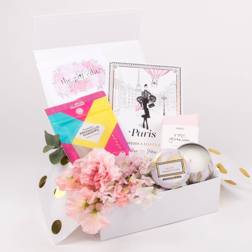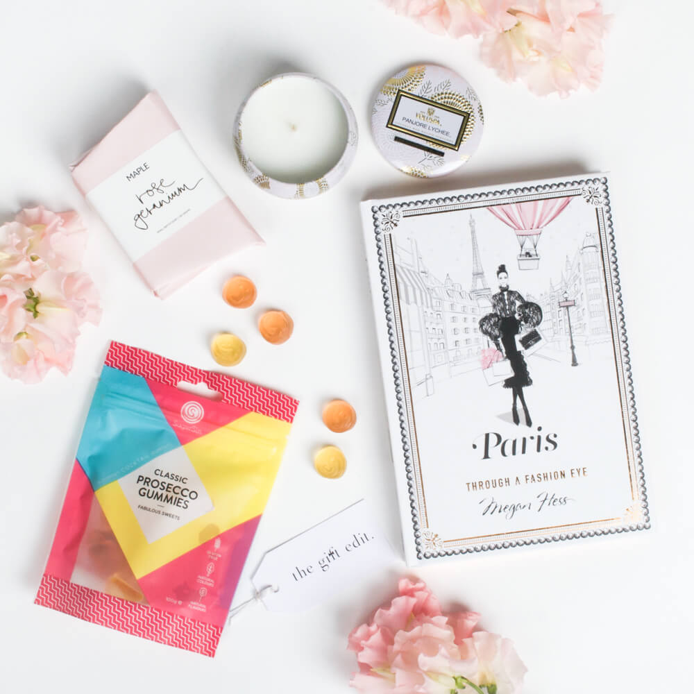 As part of our Tribute to Fashion Collection, this coveted gift box also includes delicious Prosecco Gummies from Sugar Sin; Voluspa's Panjore Lychee decorative candle with notes of Lychee and Cassis, and Glasshouse Fragrances' beautiful Marseille Memoir Body Bar, perfect for birthdays, Mother's Day, House Warming or Christmas.