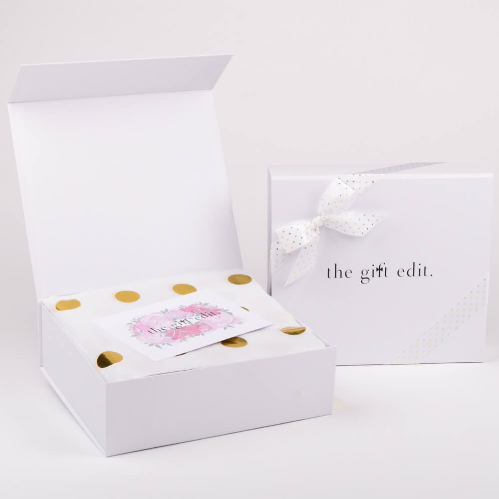 All these products are encased in our white signature collection box, wrapped with gold foil polka dot tissue paper and tied with a white ribbon ready to give.