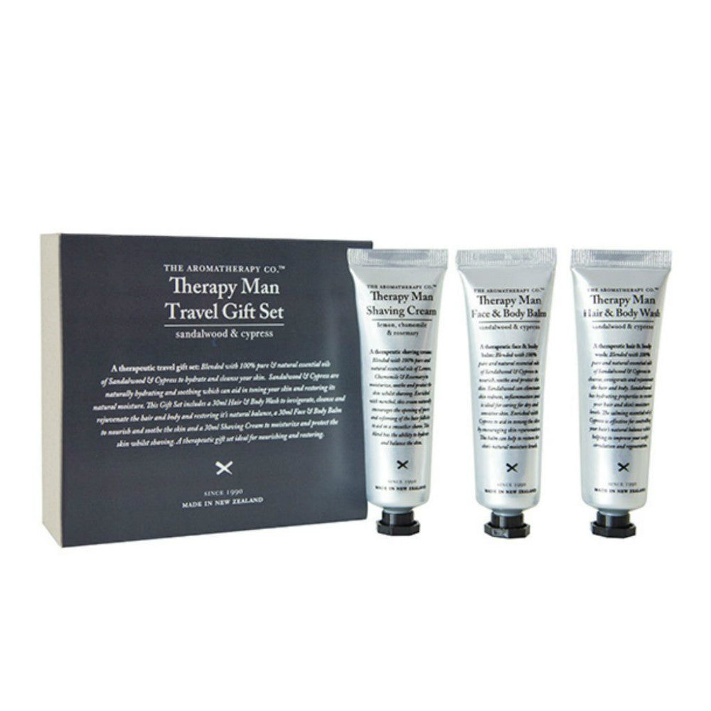 - Men’s Travel Set (Therapy Man Shaving Cream, Hair & Body Wash and Face & Body Balm) by The Aromatherapy Co.