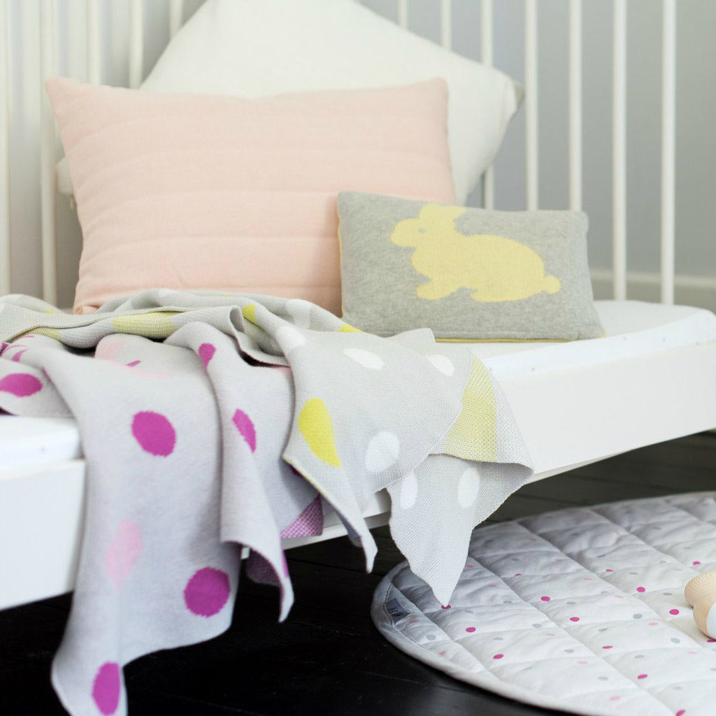 A beautiful soft 100% cotton blanket with a cute polka dot design perfect for the pram, car and cot to keep your baby snug and warm.